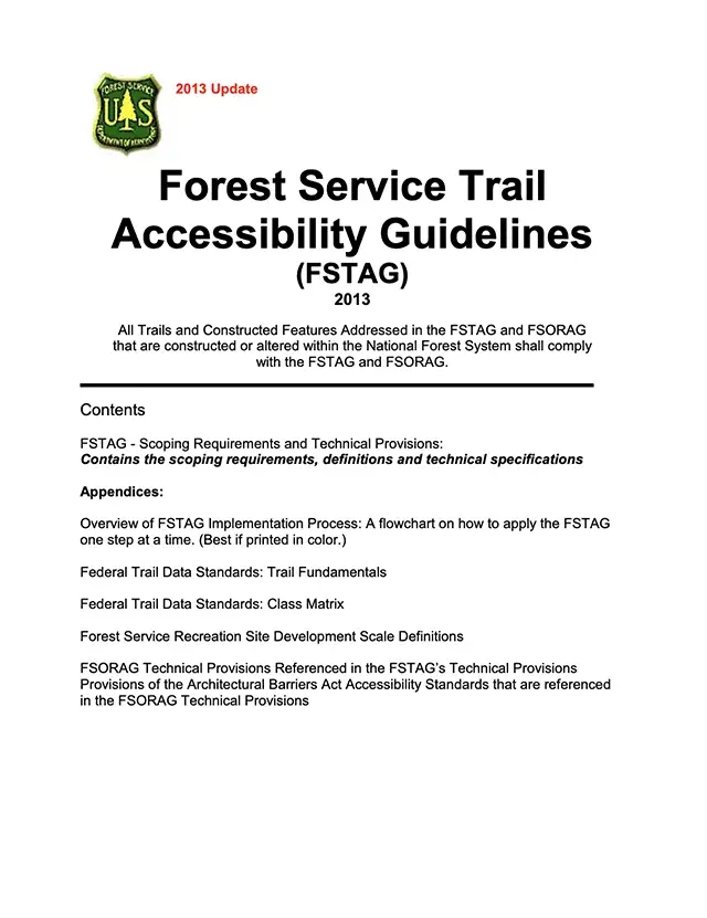 Recommended Resource: For comprehensive guidance on features like parking, restrooms, signage, and connected amenities, see the Forest Service Trail Accessibility Guidelines (FSTAG).