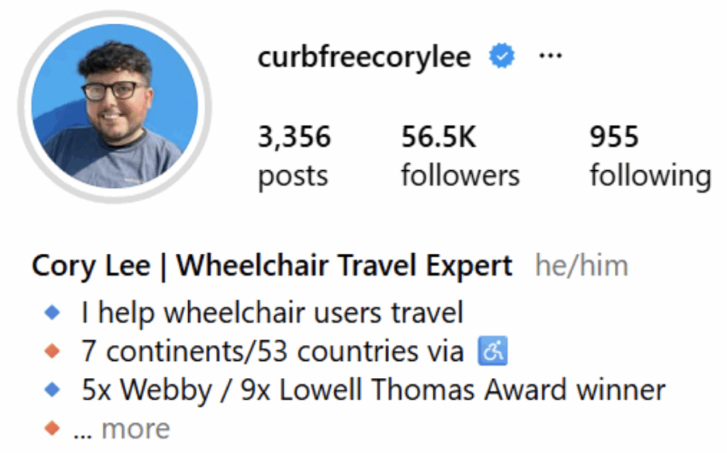Wheelchair travel content creator with Instagram and YouTube. See his fall trip to Vermont.
